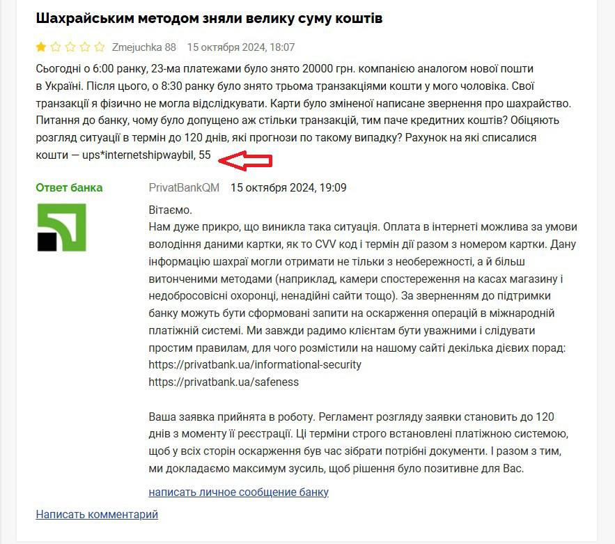 Інформація про несанкціоновані перекази на користь UPS з'являлася ще в середині жовтня. Наприклад, клієнт "Привату" під ніком Zmejuchka88 повідомила, що у неї за три транзакції на користь цієї компанії зняли 20 тисяч гривень, хоча вона сама не підтверджувала таких сплат. Вона навіть навела опис до рахунку, який побачила у банківській виписці: "ups*internetshipwaybit,55".