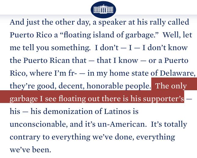 Після появи відео, де Байден каже, що "єдине сміття, яке я бачу, це його [Трампа] прихильники", на сайті Білого дому вийшла розшифровка промови.