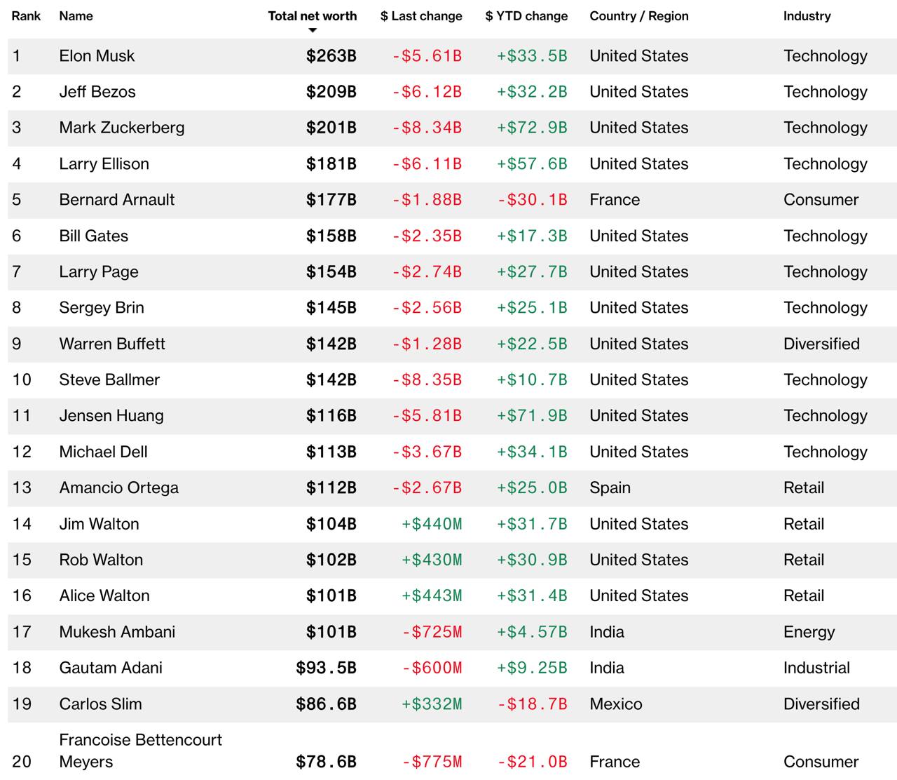 На першому місці – Ілон Маск. Його статки оцінюються в 263 млрд доларів, за рік він заробив 33,5 млрд. доларів.