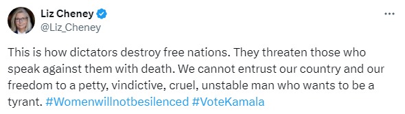 "Ось як диктатори знищують вільні нації. Вони загрожують смертю тим, хто виступає проти них. Ми не можемо довірити нашу країну і нашу свободу дрібній, мстивій, жорстокій, нестабільній людині, яка хоче бути тираном", - написала Чейні в соцмережі Х, супроводивши допис хештегами "Жінки не мовчатимуть" та "Голосуйте за Камалу".