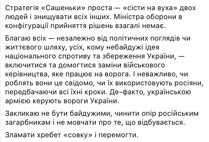 Також вона пише про те, що "зараз забирають людей із прикриття аеродромів, артилерійських розрахунків, навіть із Patriot – усіх відправляють у піхоту".
