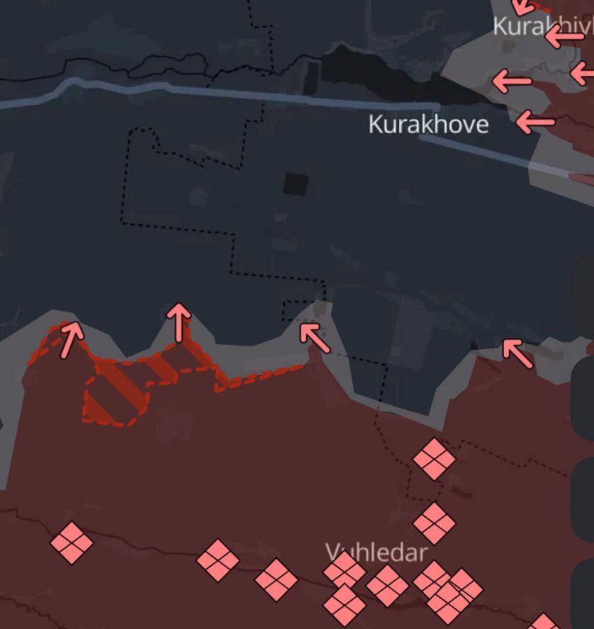 08:16 Російські війська знову просунулися на південний захід від Курахового, фіксує мапа військового паблику Deep State.
