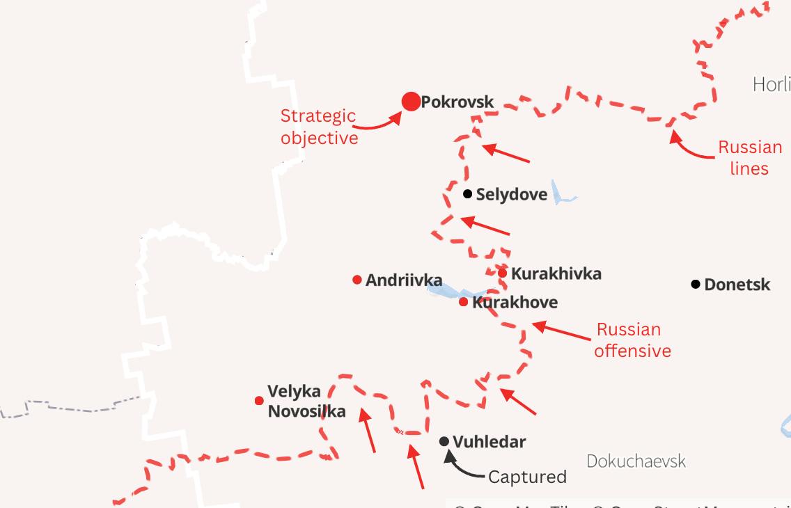 Росіяни наступають на фронті завширшки до 65 кілометрів від Селидового до Великої Новосілки та планують оточити район Курахового. Україна до кінця року може втратити це місто.
