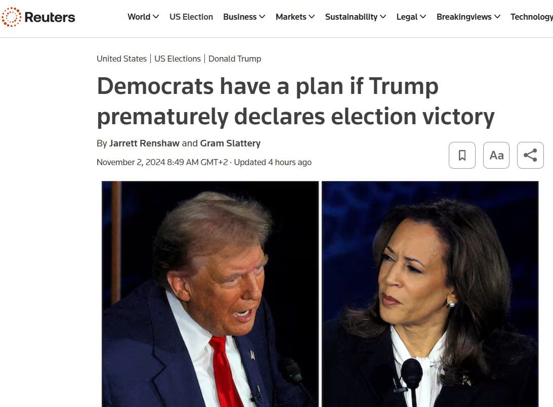 У штабі Трампа агентству Reuters повідомили, що кандидат від Республіканської партії боротиметься за всі голоси до закриття виборчих дільниць, але не дали прямої відповіді на питання про те, чи планує Трамп знову оголосити про свою перемогу до оголошення результатів перегонів, як він це зробив у 2020 року.