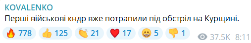 "Перші військові КНДР вже потрапили під обстріл на Курщині", - заявив Коваленко, не наводячи подробиць.