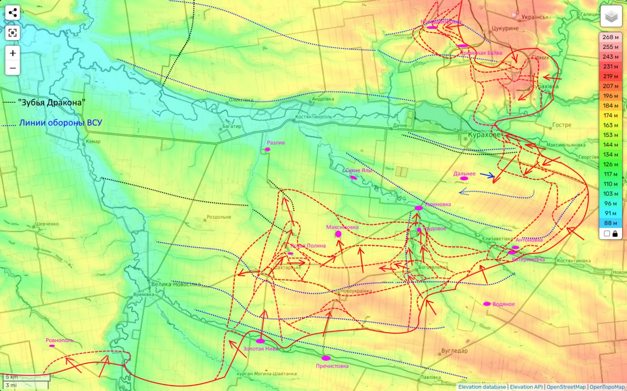 Російські війська наближаються з півдня до села Розлив, що має ключове значення. Це загрожує перерізанням дороги, що веде із заходу до Курахового. Після чого українські війська у цьому місті опиняться під загрозою оточення.