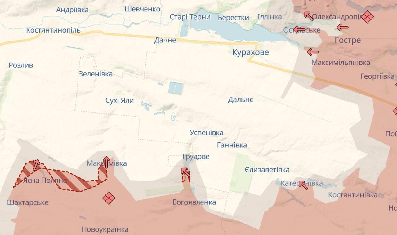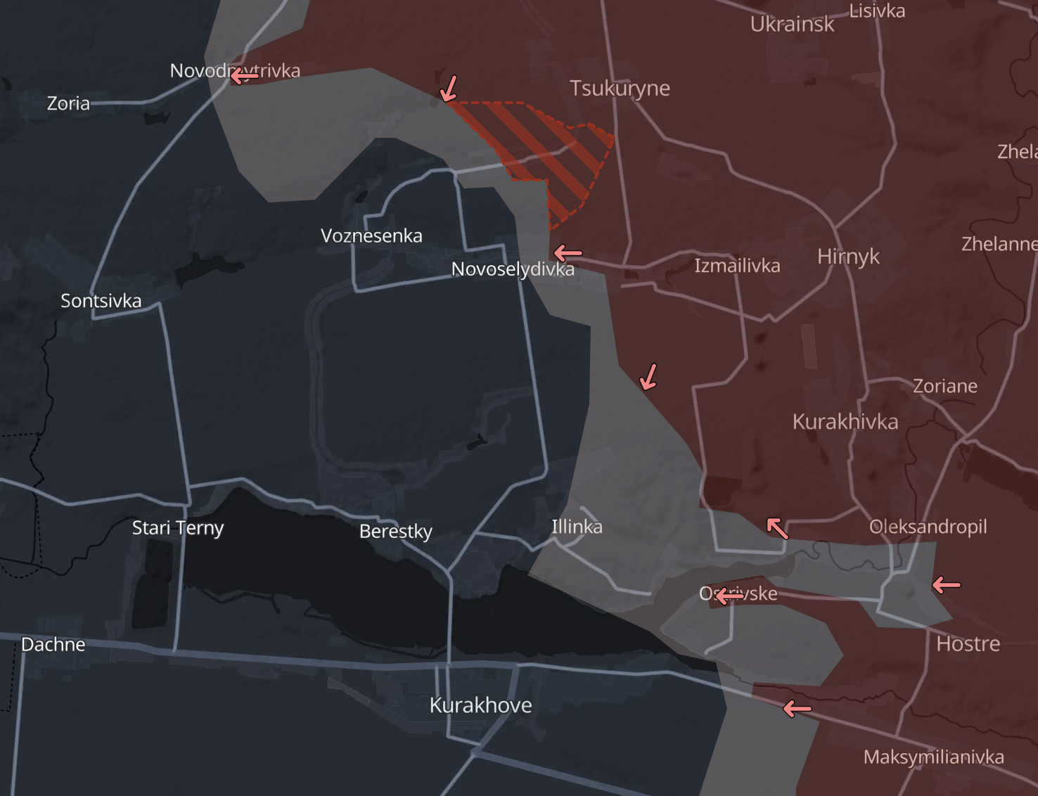 На північ від Курахового DS підтверджує просування РФ у бік Вознесенки. Українські ж військові пишуть, що втрачено села Новодмитрівка та більшість Новоселидівки. Також захоплено село Іллінка із наступною атакою на сусідні Берестки.