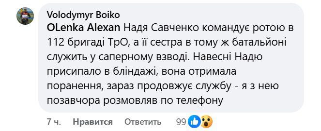 "Надя Савченко командує ротою у 112-й бригаді ТРО, а її сестра в тому ж батальйоні служить у саперному взводі. Навесні Надю присипало у бліндажі, вона отримала поранення, зараз продовжує службу", - написав він у Фейсбуці.