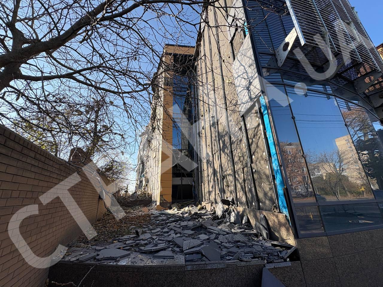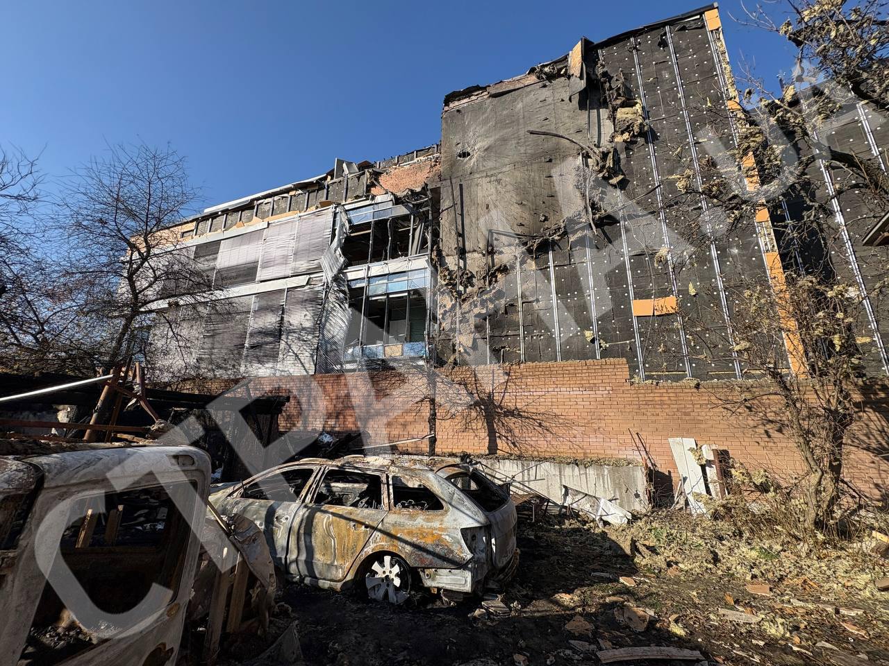 12:13 Наслідки прильоту "Шахеда" за будівлею бізнес-центру у Солом'янському районі Києва.