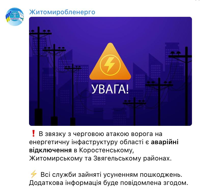 09:46 У низці районів Житомирської області аварійні відключення світла через прильоти з енергетики, повідомляє обленерго.