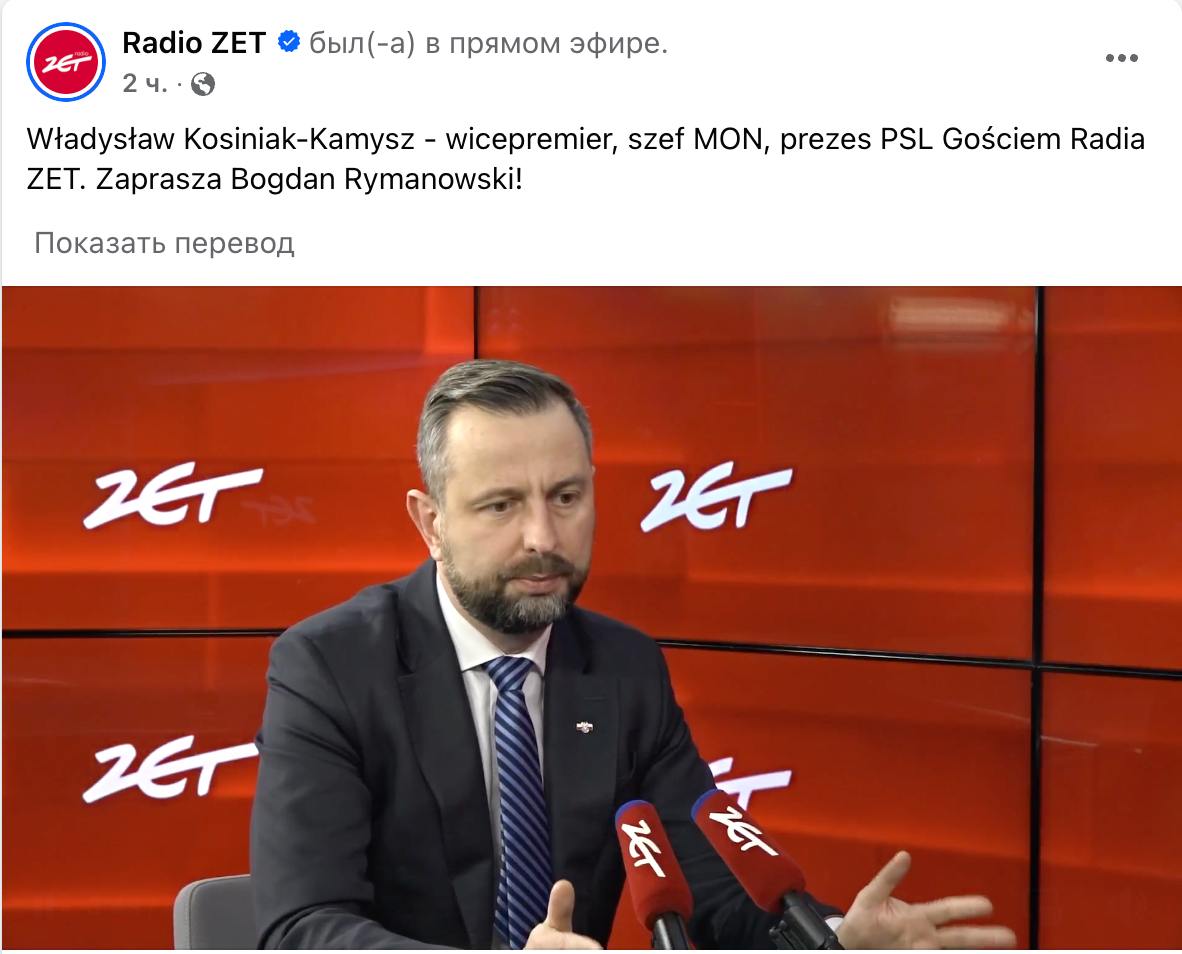 Таку заяву польський віце-прем'єр та міністр оборони Владислав Косиняк-Камиш зробив в ефірі Radio Zet.