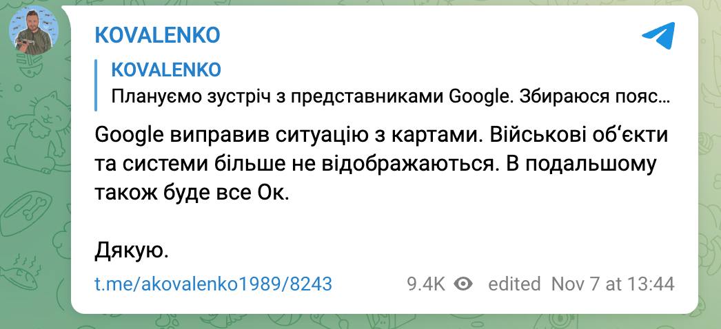 3 листопада він повідомляв, що Google оновив знімки на картах, "спаливши" розміщення українських військових систем. Відразу було подано запит, але Google не міг його виправити через вихідні.