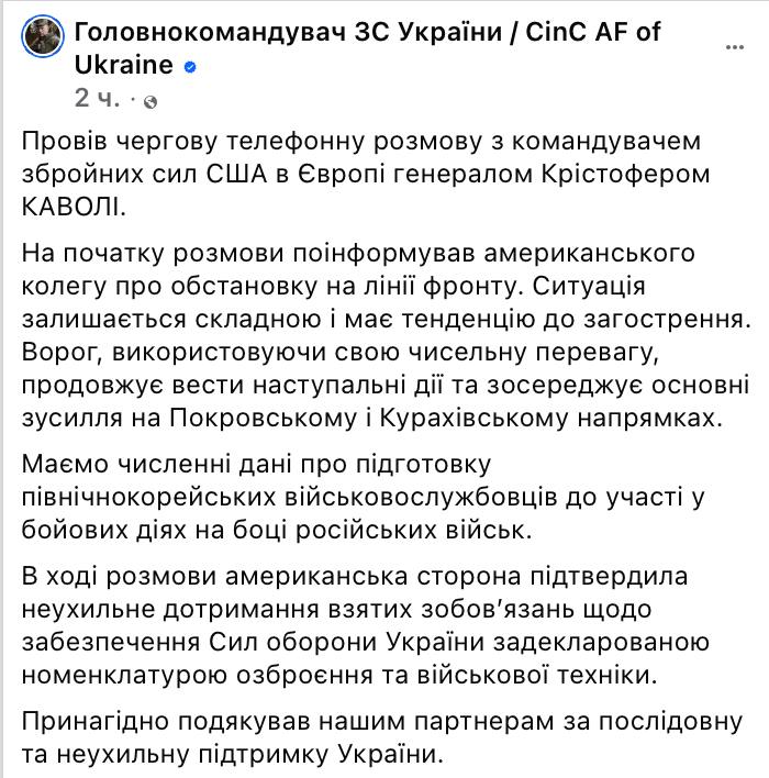 Про це заявив головком ЗСУ Олександр Сирський командувачу сил США в Європі Крістофер Каволі.