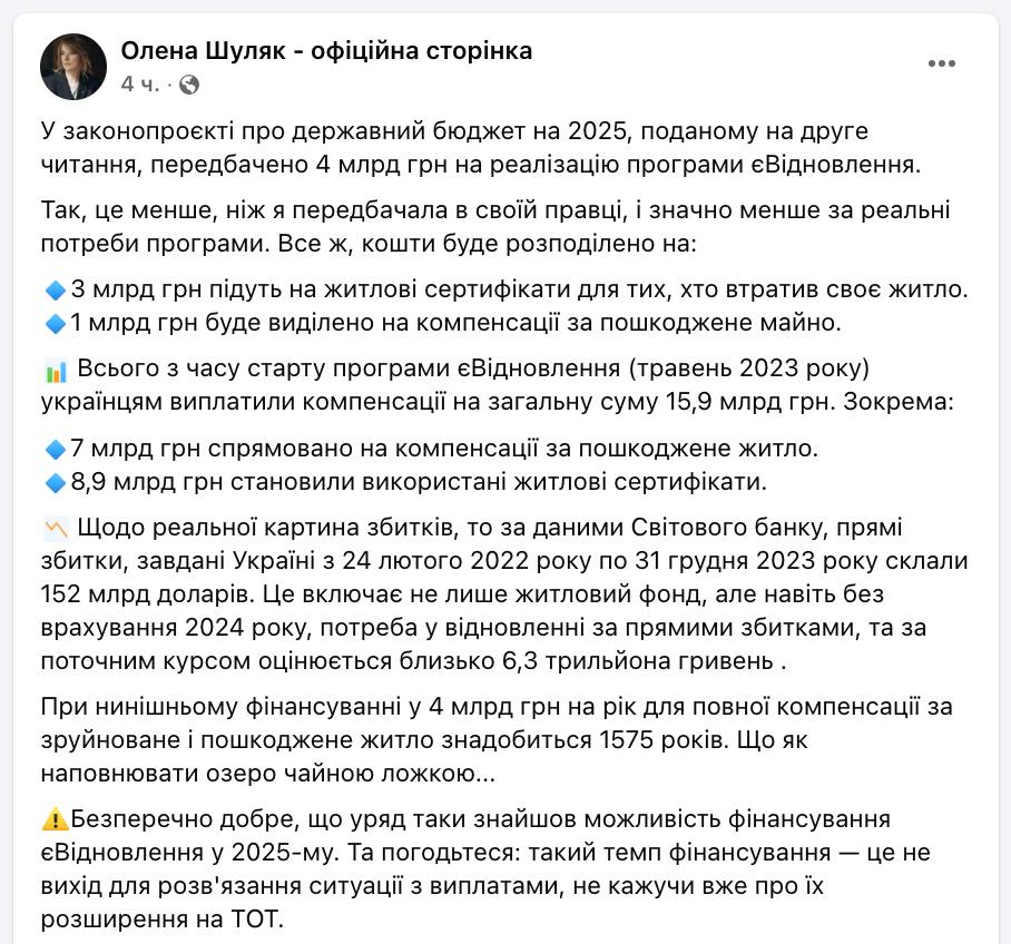 Так вона прокоментувала те, що проект бюджету на 2025 рік передбачає виділення 4 млрд. гривень ($96,7 млн.) на виплату компенсацій за зруйноване житло.