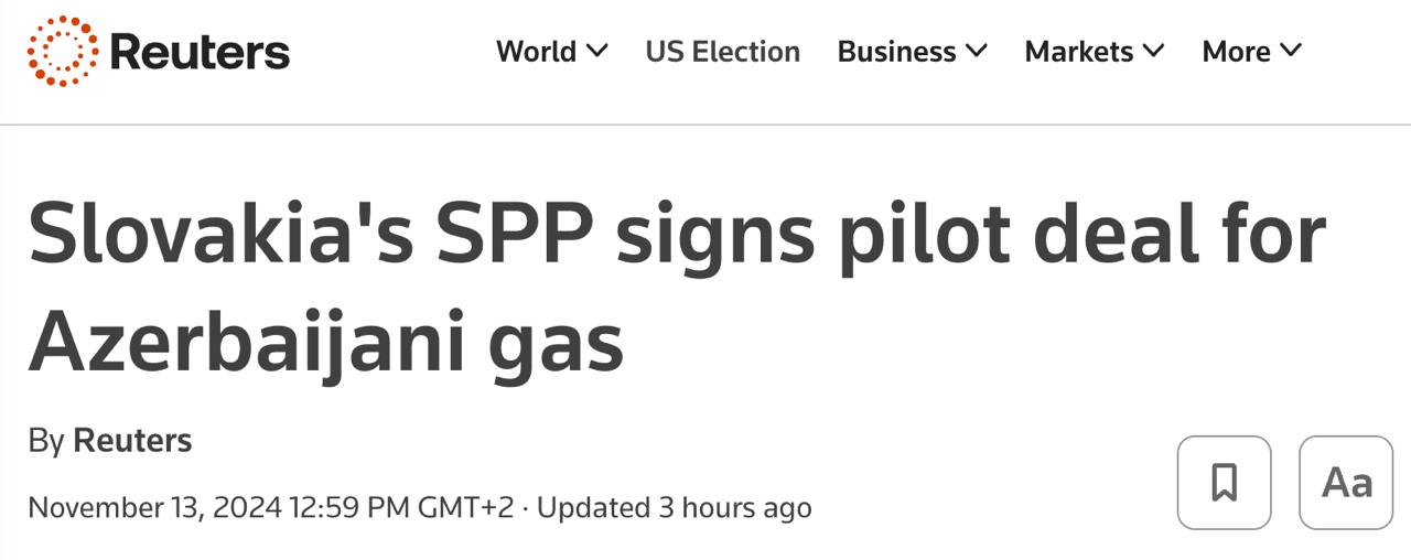 Основний покупець газу в Словаччині компанія SPP підписала короткостроковий пілотний контракт на закупівлю природного газу з Азербайджану та розгляне можливість укладання більш довгострокової угоди, оскільки готується до можливого припинення постачання російського газу через Україну