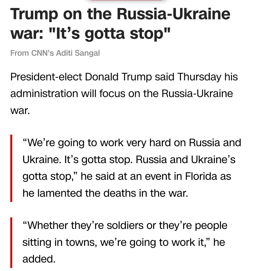 Раніше майбутній радник Трампа з нацбезпеки Майк Уолц підтвердив, що обраний президент має намір посадити Україну та Росію за стіл переговорів для завершення війни. Він зазначив, що визначальною щодо України в Білому домі буде думка Трампа.