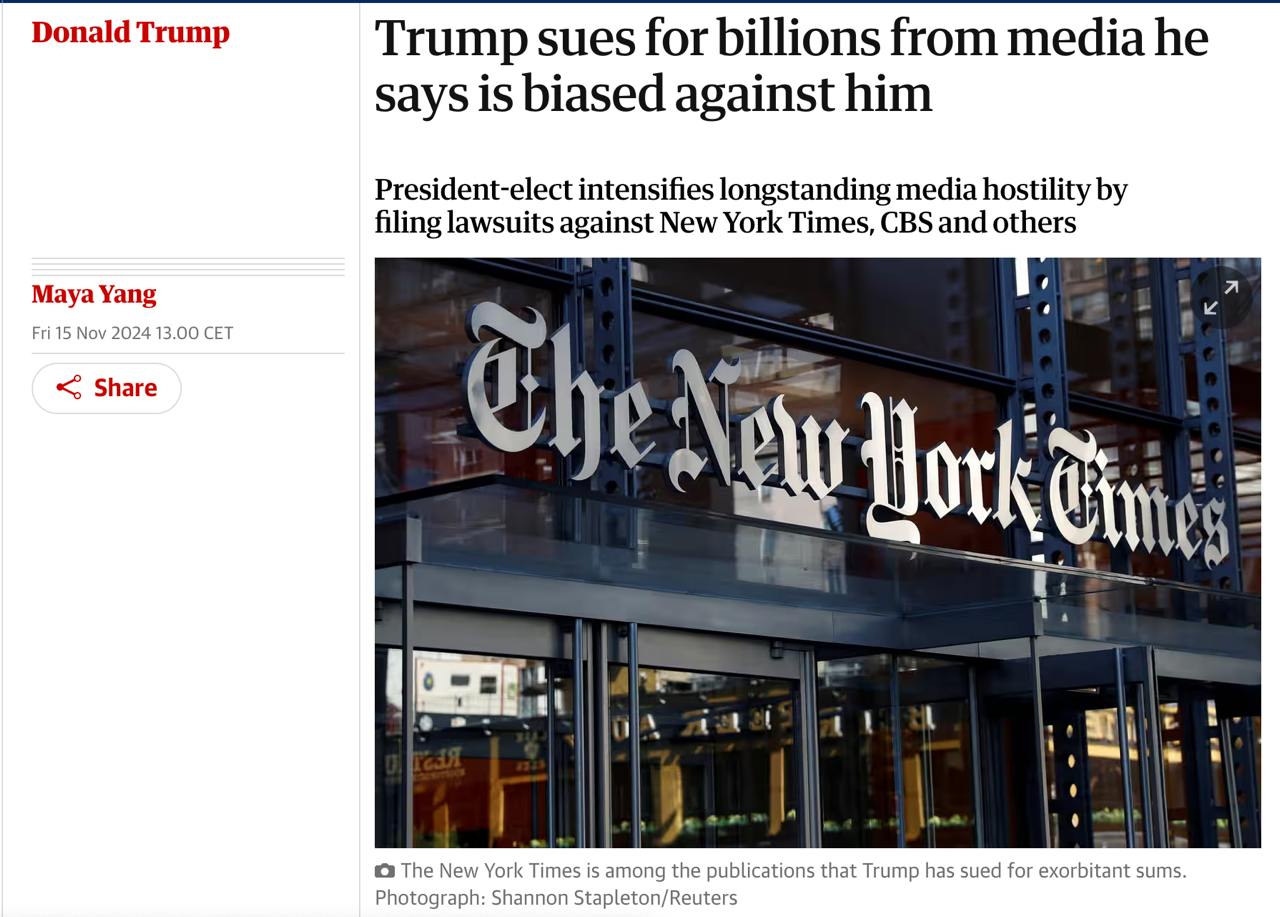 Обраний президент США Дональд Трамп подав позови на мільярди доларів проти кількох американських медіа, включаючи The New York Times, Penguin Random House, Daily Beast та CBS News. Республіканець звинуватив їх у "упередженому відношенні" та "політичному цькуванні".