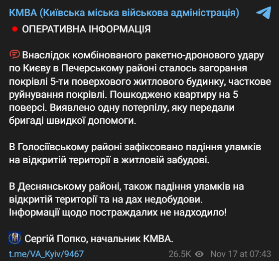 Росіяни завдали комбінованого ракетно-дронового удару по Києву. Пошкодження зафіксовано у трьох районах столиці.