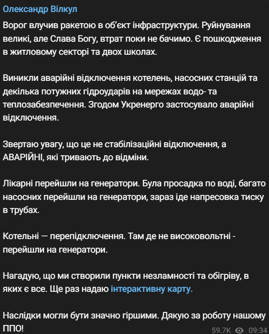 У місті немає світла, лікарні перейшли на генератори. Також зникала вода, насосні станції зараз переводять на альтернативні джерела живлення.