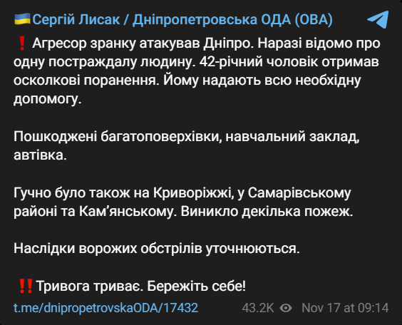 У Дніпрі через атаку РФ 42-річний чоловік отримав уламкові поранення, повідомив голова ОВА Сергій Лисак.