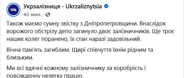 "В результаті ворожого обстрілу депо загинули двоє залізничників. Ще трьох наших колег поранено, їхній стан поки що задовільний", - йдеться в повідомленні.