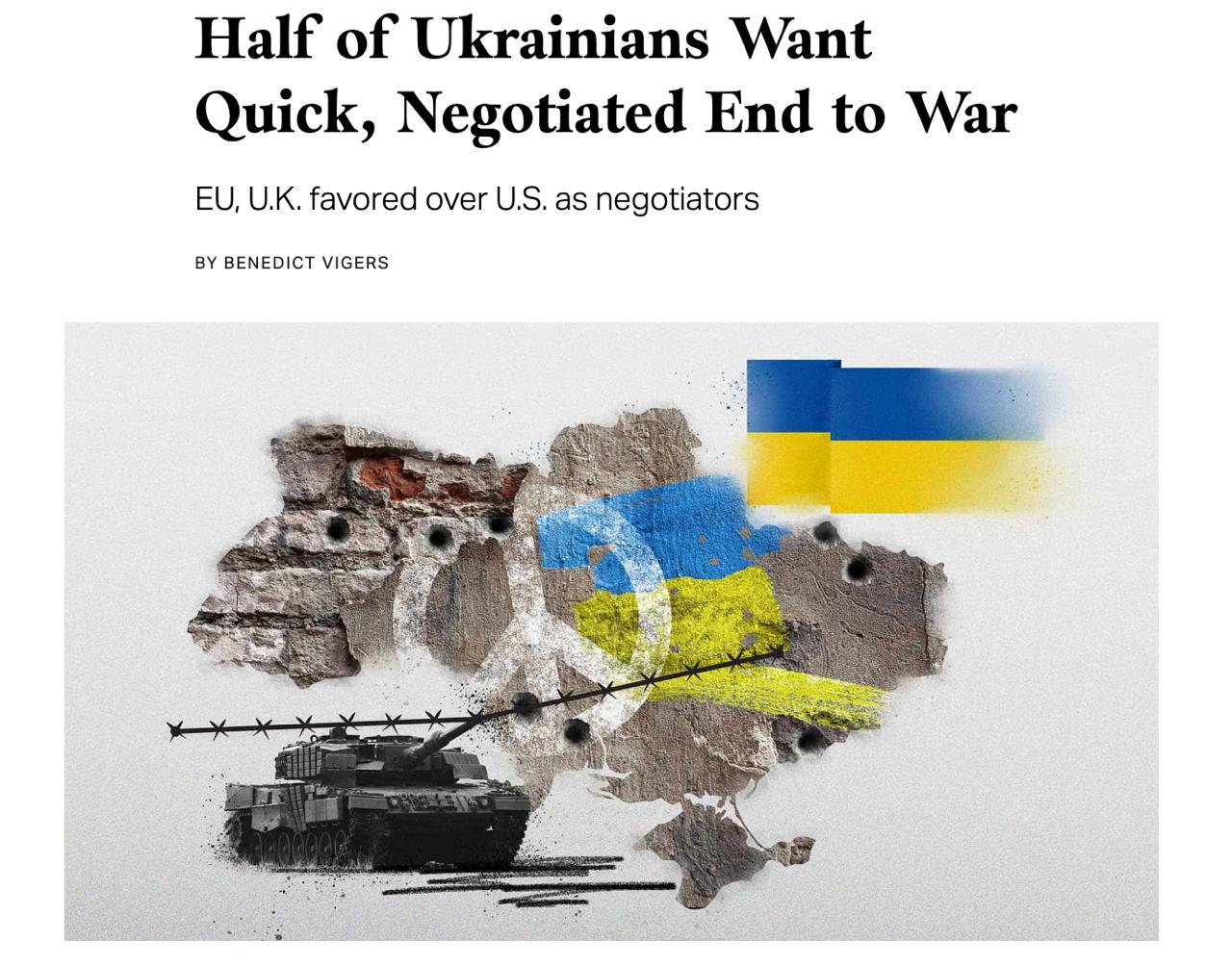 Згідно з дослідженням, проведеним у серпні та жовтні 2024 року, в середньому 52% українців хотіли б, щоб Україна якнайшвидше провела переговори про припинення війни. І лише 38% вважають, що країна має продовжувати боротьбу до перемоги.
