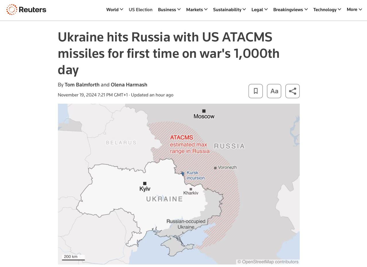 Заявляється, що удар завдався "в рамках нової політики США, яка більше не накладає на Україну заборону застосовувати американські далекобійні ракети з метою Росії".