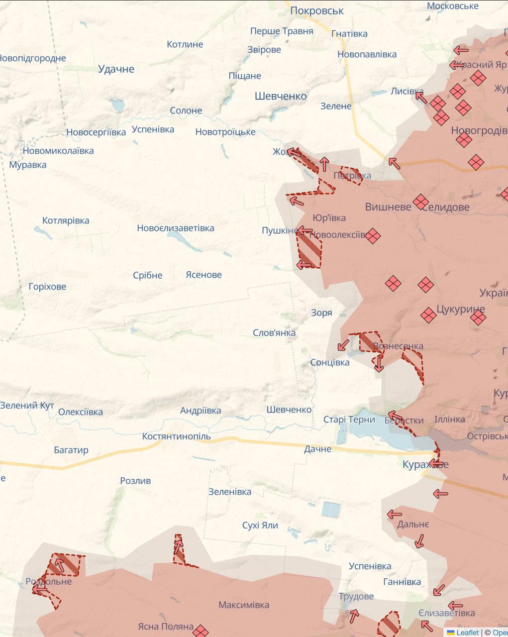 Під Покровськом триває спроба обійти його з півдня, росіяни просунулися у Жовтому та сусідніх населених пунктах, а також у кількох ділянках аж до Курахівського напрямку.