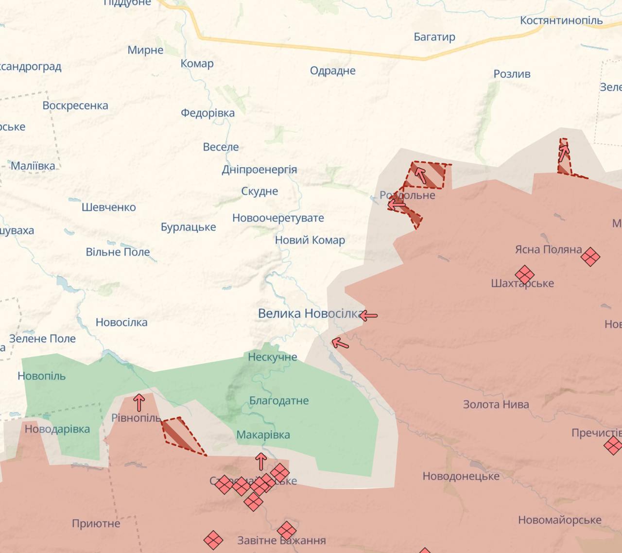 Трохи на захід від армія РФ знову просунулась до траси на Велику Новосілку з боку Богатиря.