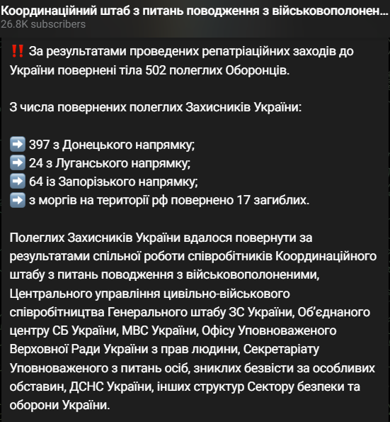 "За результатами проведених репатріаційних заходів на підконтрольну Уряду України територію повернуто тіла 502 полеглих Захисників", - йдеться у повідомленні.