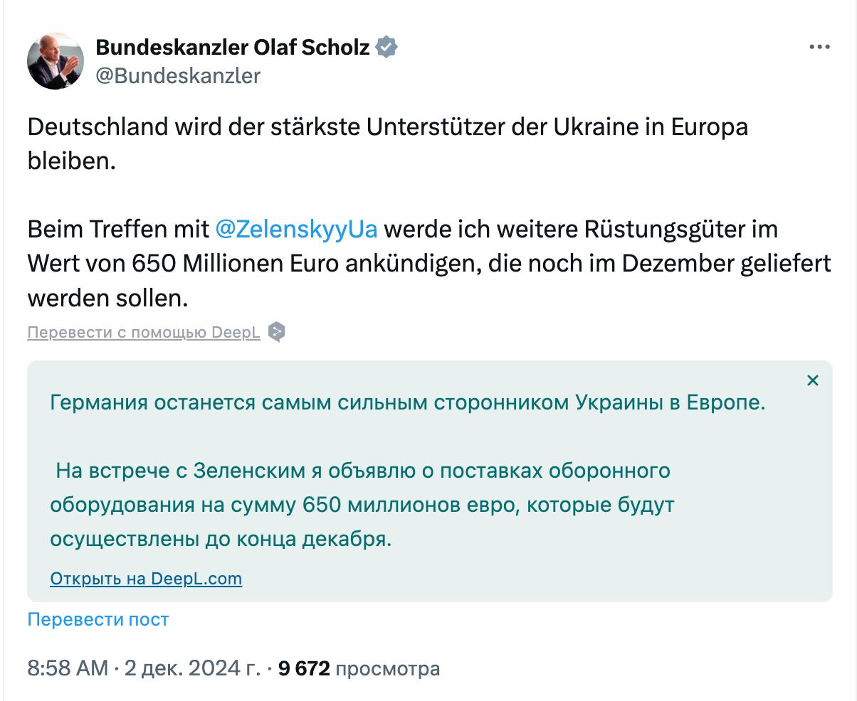У себе в Х Шольц анонсував, що на зустрічі із Зеленським у Києві оголосить про пакет військової допомоги на 650 мільйонів євро, який буде передано до кінця року.