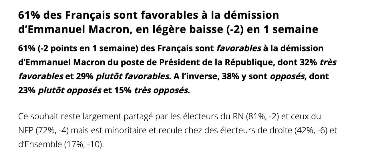 Згідно з опитуванням, проведеним на замовлення телеканалу BFMTV, більшість французів (61%) підтримують відставку Макрона.