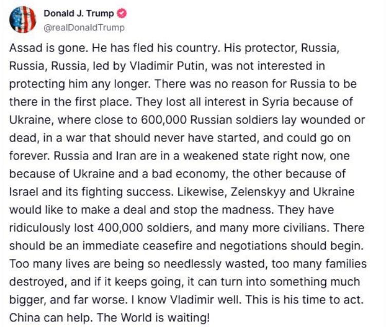 "Зеленський і Україна хотіли б укласти угоду і зупинити цей божевільний конфлікт. Вони безглуздо втратили 400 тисяч солдатів і набагато більше цивільних осіб. Необхідні негайне припинення вогню та початок переговорів. Занадто багато життів втрачається даремно, надто багато сімей зруйновано, і якщо це триватиме., все може перерости в щось більш масштабне і жахливе. Володимира. Зараз його час діяти. Китай може допомогти.