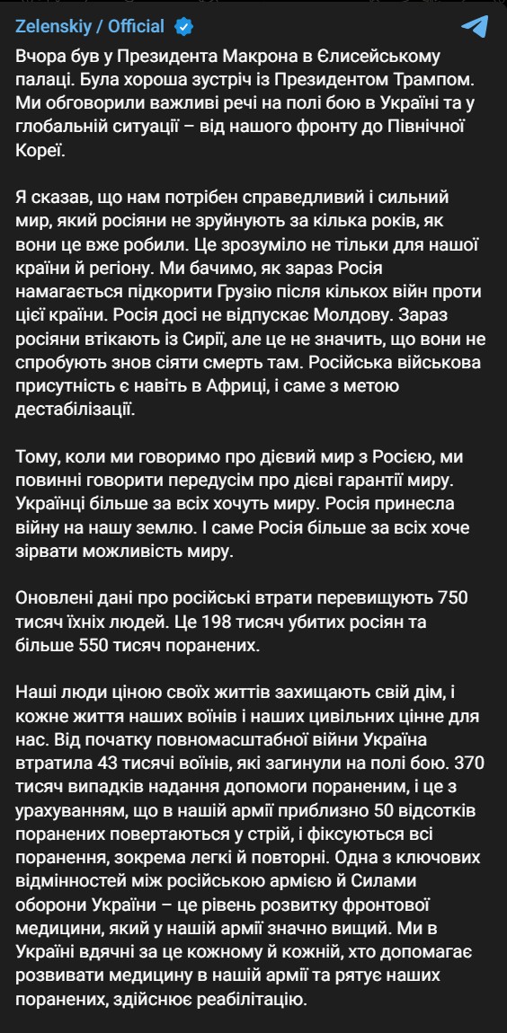"Я сказав, що нам потрібен справедливий і сильний мир, який росіяни не зруйнують через кілька років, як вони це вже робили. Тому, коли ми говоримо про дієвий мир із Росією, ми маємо говорити насамперед про дієві гарантії миру", - написав президент.