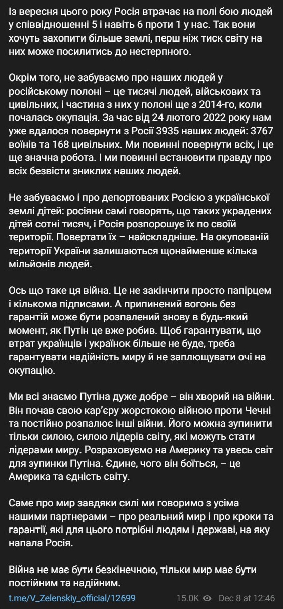 Він ще раз зазначив, що не приймає жодних мирних угод без гарантій безпеки.
