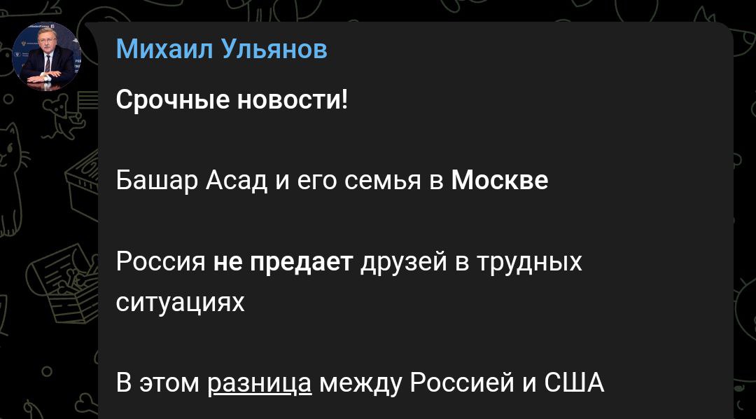 "Башар Асад та його родина в Москві. Росія не зраджує друзів у важких ситуаціях", - написав Михайло Ульянов.