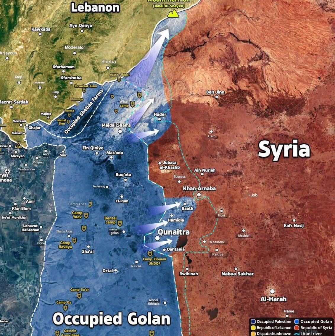 Причому ЗМІ пишуть, що ізраїльтяни вийшли за межі буферної зони та атакували населені пункти Ель-Кунейтру, Ель-Баас, Ель-Хамідія, а на північ - Хадр, важливий для комунікацій Лівану через сирійську територію. Ізраїльська авіація посилено бомбардує цілі на півдні Сирії - в районі провінцій Дараа та Ес-Сувейду.