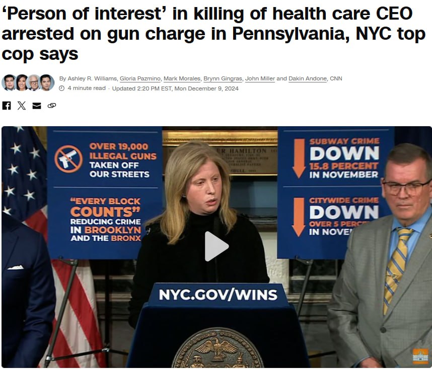 Сьогодні CNN повідомив, що поліція затримала підозрюваного у вбивстві гендиректора UnitedHealthcare.