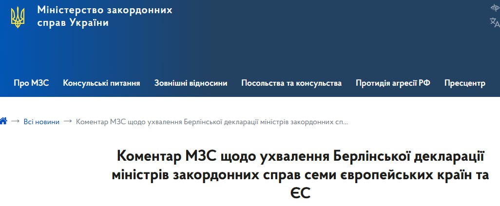 "Берлінська декларація чітко наголошує на підтримці партнерами України на її незворотному шляху до повної євроатлантичної інтеграції, включаючи членство в НАТО, а також на шляху до вступу до ЄС. Міністри також підтверджують, що стійка безпека Європи нерозривно пов'язана з відновленням всеосяжного, справедливого та сталого світу для України на основі міжнародного права, включаючи Статут ООН, з повагою до Суверенітету та територіальної цілісності України. Важливо, що документ висловлює подальшу підтримку Формулі світу як надійного шляху до такого світу”, - повідомляє МЗС.
