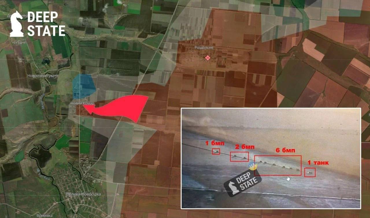 15:58 Українські та російські військові паблики пишуть про новий прорив росіян до села Новий Комар, що на північ від Великої Новоселівки.