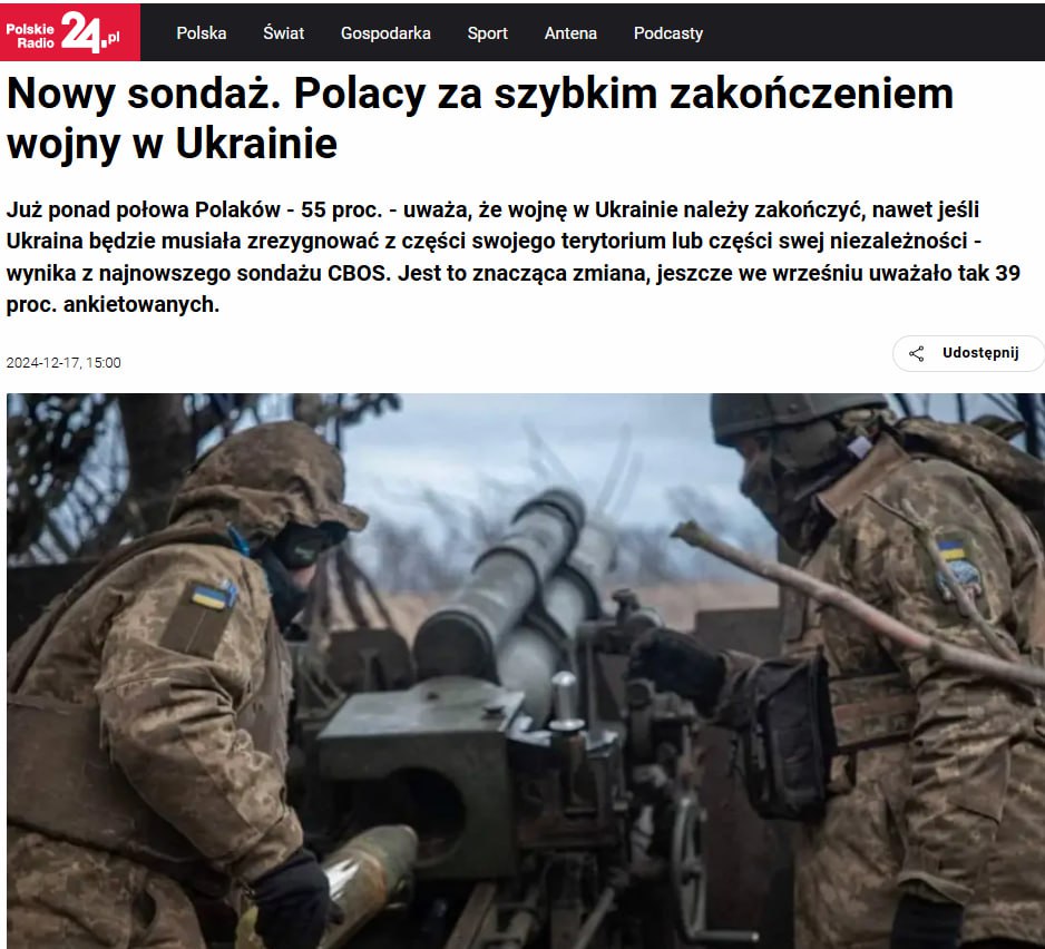CBOS зазначає, що вперше з початку вторгнення Росії в Україну серед поляків домінує думка, що головним пріоритетом має бути досягнення миру та припинення бойових дій, навіть якщо це вимагатиме від Києва територіальних чи суверенних поступок.