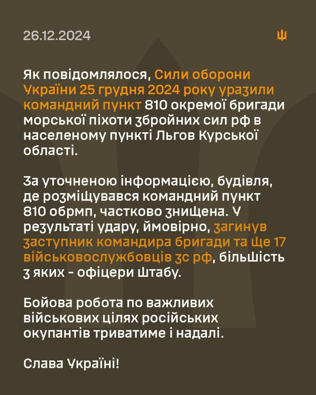 16.36 Стратком ЗСУ заявляє, що внаслідок вчорашнього удару по командному пункту у Льгові Курської області загинув заступник командира російської 810-ї бригади морської піхоти, що базується у Севастополі.