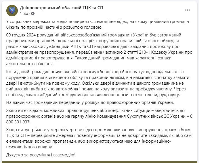 18.14 Дніпропетровський облТЦК прокоментував інцидент, коли чоловік виліз із вікна бусика на ходу.