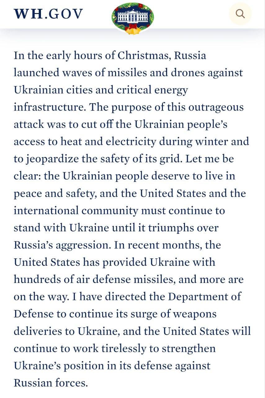 "Метою цієї обурливої атаки було позбавити український народ доступу до тепла та електрики в зимовий період та поставити під загрозу безпеку електромереж", - йдеться у заяві Байдена.