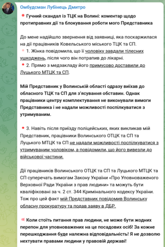 Про це повідомив уповноважений із прав людини в Україні Дмитро Лубинець у своєму телеграм-каналі.