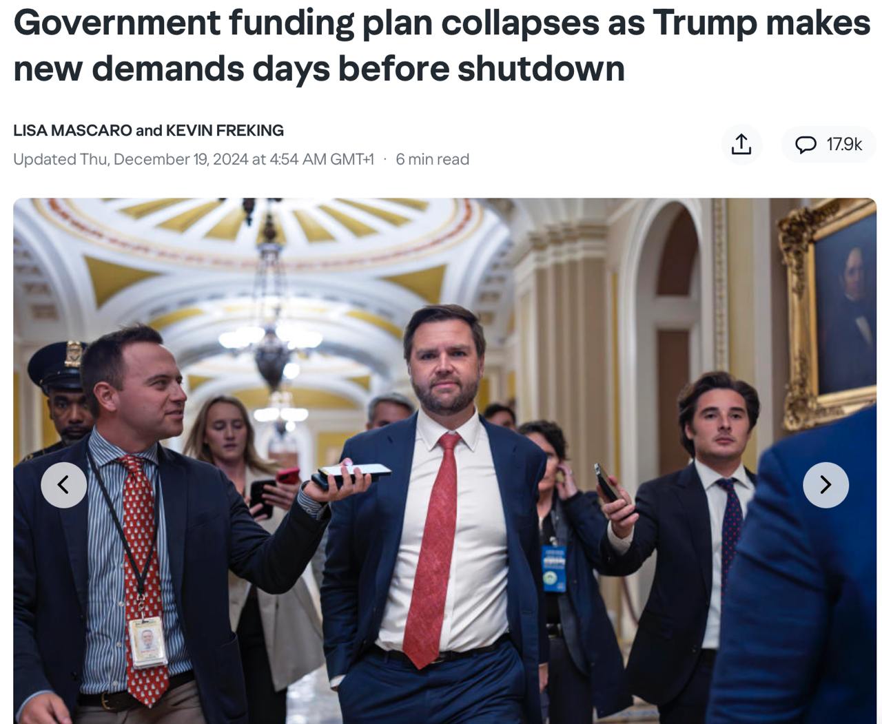 Обраний президент і майбутній віце-президент Джей Венс зажадали від республіканців у Конгресі заблокувати продовження бюджету США - без чого уряд може після католицького Різдва зупинити свою роботу. Тобто настане "шатдаун".