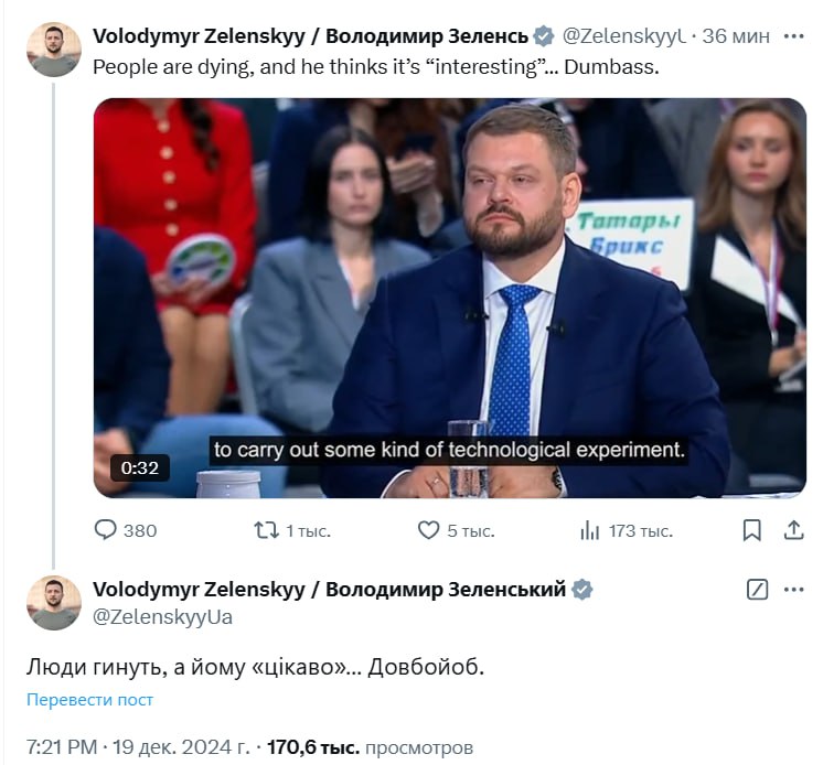 "Люди гинуть, а йому цікаво… Долбо@б", – прокоментував український президент у Х пропозицію Путіна влаштувати експеримент із ударом "Горішником", повідомивши заздалегідь місце та час удару, щоб Україна могла використати для його поразки будь-які західні системи ППО.
