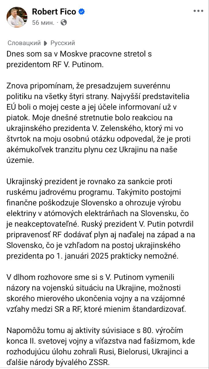 Словацький прем'єр-міністр Роберт Фіцо повідомив про подробиці зустрічі з Владимиром Путіним у Кремлі, яка відбулася ввечері 22 грудня.