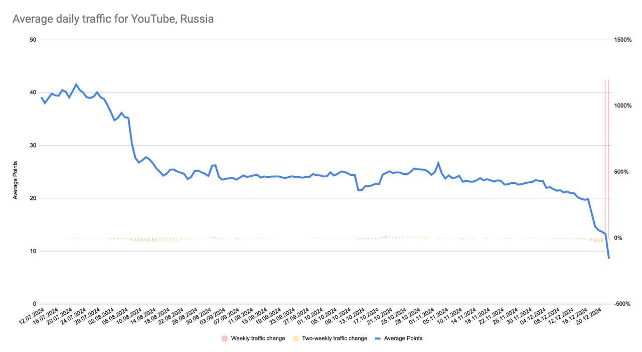 У Росії фактично заблоковано популярний відеохостинг YouTube. Зайти на платформу не можуть 80% населення країни, перегляди становлять близько 20% нормального значення.