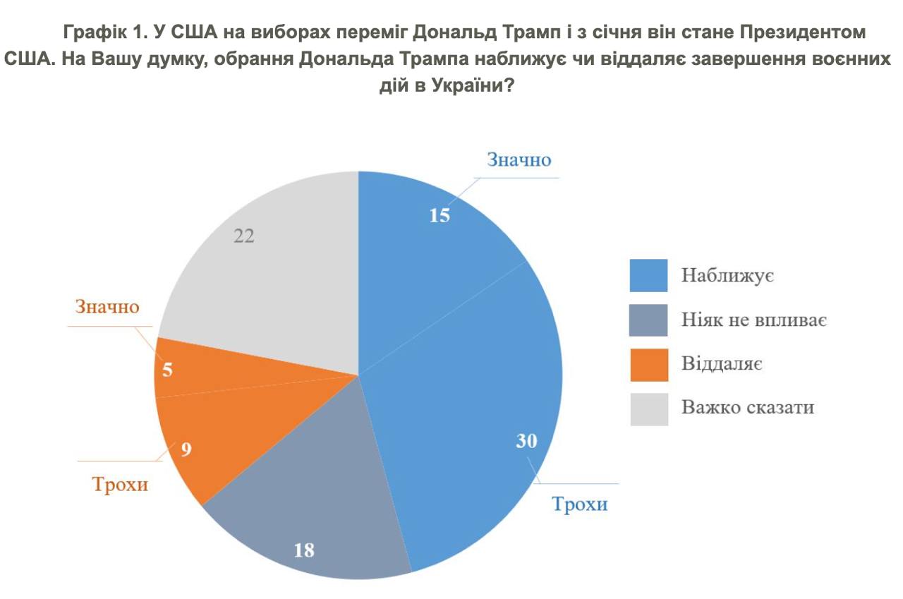 Соціологи запитали, перемога Трампа наближає чи видаляє мир в Україні. Досить тверду впевненість у тому, що мир став ближчим, висловили 15% опитаних, а 30% вважають, що мир стає лише трохи ближчим. У тому, що мир, навпаки, стає віддаленішим, упевнені 14%. Інші 40% або вважають, що нічого не зміниться, або не змогли визначитися зі своєю думкою.